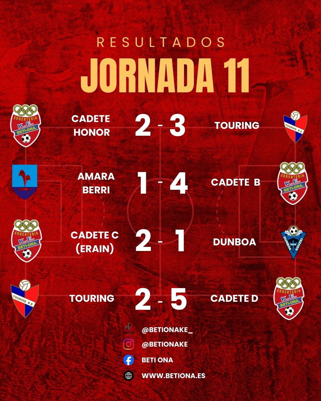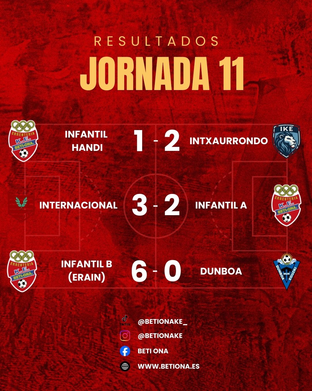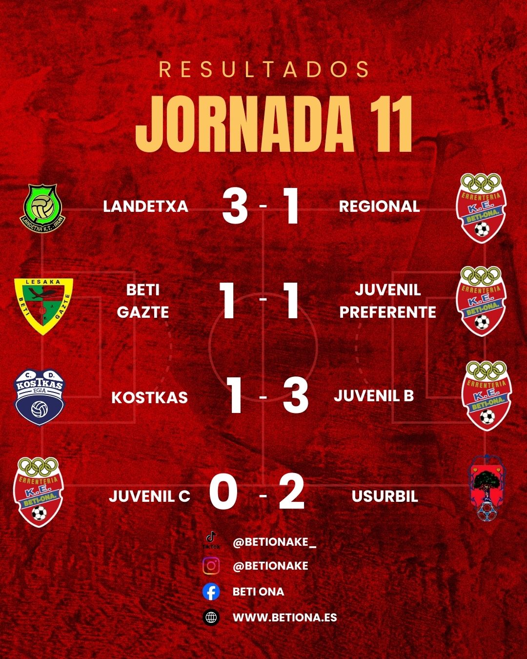 La segunda mitad comenzó con el mismo guion: buen tono del conjunto visitante y nuevas llegadas al área rival. Pero en el minuto 66, tras otro saque de esquina y un barullo dentro del área, el Landetxa logró adelantarse en una acción muy protestada, ya que el balón fue introducido con la mano. El colegiado, tapado por los jugadores y sin asistentes, dio validez al gol en una jugada imposible de apreciar en directo. Lejos de venirse abajo, nuestros regionales sacaron orgullo y se volcaron por completo sobre la portería local, generando numerosas ocasiones clarísimas. En el minuto 89, un disparo a bocajarro se estrelló en el larguero, botó dentro de la línea de gol y salió fuera, en una de esas jugadas que resumen perfectamente la tarde. El Landetxa pedía el final del encuentro mientras perdía todo el tiempo posible. Aún hubo tiempo para otra ocasión inmejorable: un pase lateral dejó solo a nuestro extremo ante el portero, una de esas acciones que entran 99 de cada 100, pero hoy la pelota volvió a negar el gol a quien más lo buscó. Ya en el descuento, con el equipo completamente volcado, una contra puso la puntilla definitiva. Hacía tiempo que no se presenciaba una injusticia tan grande, pero como dice otro de los grandes tópicos del fútbol, no siempre gana el que mejor juega y más lo merece. Y hoy fue uno de esos días. Pese al resultado, hay que estar orgullosos de estos chavales, de la lucha, la entrega, el pundonor y la identidad mostrada durante los noventa minutos. Hoy el Beti Ona demostró ser un gran equipo. Pese a que la fase de ascenso ya no es posible, el equipo seguirá peleando hasta el último partido de esta fase y afrontará la copa con toda la ilusión de ganarla. ¡Vamos equipo!