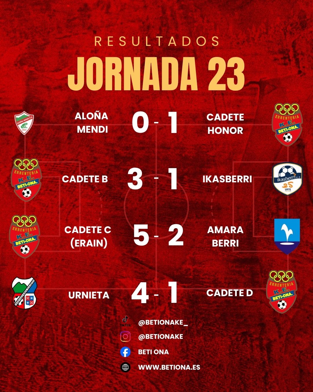 Se adelantaba al día del padre el partido de nuestro Cadete de Honor en Oñati, en un duelo de máxima igualdad, con ambos equipos empatados en la clasificación y en plena lucha por los objetivos. Los nuestros salieron muy intensos desde el primer minuto, incomodando la salida de balón rival y dificultando su juego de ataque. Por otro lado, nuestra línea defensiva, bien ordenada, impidió cualquier amago de ataque rival. A pesar del aplastante dominio de los nuestros durante los primeros 40 minutos, el resultado no se movió y tocaba seguir buscando los puntos débiles del rival para tratar de hacer gol. 0-0. Tras el paso por los vestuarios, el equipo dio un paso más hacia adelante, atacando por ambas bandas e infringiendo daño a través del juego exterior. En el 51´ llegó el merecido y buscado gol visitante, tras una gran jugada por la derecha. La alegría estalló en el seno de los nuestros, que se abrazaron en la banda con los animados aficionados que habían ido a animar a Oñati a los nuestros. Era el 0-1. El equipo no bajo la intensidad y mantuvo con los cambios la actitud defensiva y el potencial ofensivo. Durante la segunda mitad los locales apenas llegaron a nuestra área. El Beti Ona, erró un par de acciones claras e incluso el larguero impidió el segundo gol visitante. A pesar del infortunio, el equipo sacó una merecida victoria de un campo muy complicado, con un trabajo excepcional y un esfuerzo colectivo mayúsculo. El equipo da un salto importante en su pelea por el objetivo de permanencia y la dinámica de los chavales es inmejorable. Toca seguir trabajando para tratar de competir el siguiente encuentro contra el Añorga en casa, previo al descanso de Semana Santa. ¡A por ello equipo!