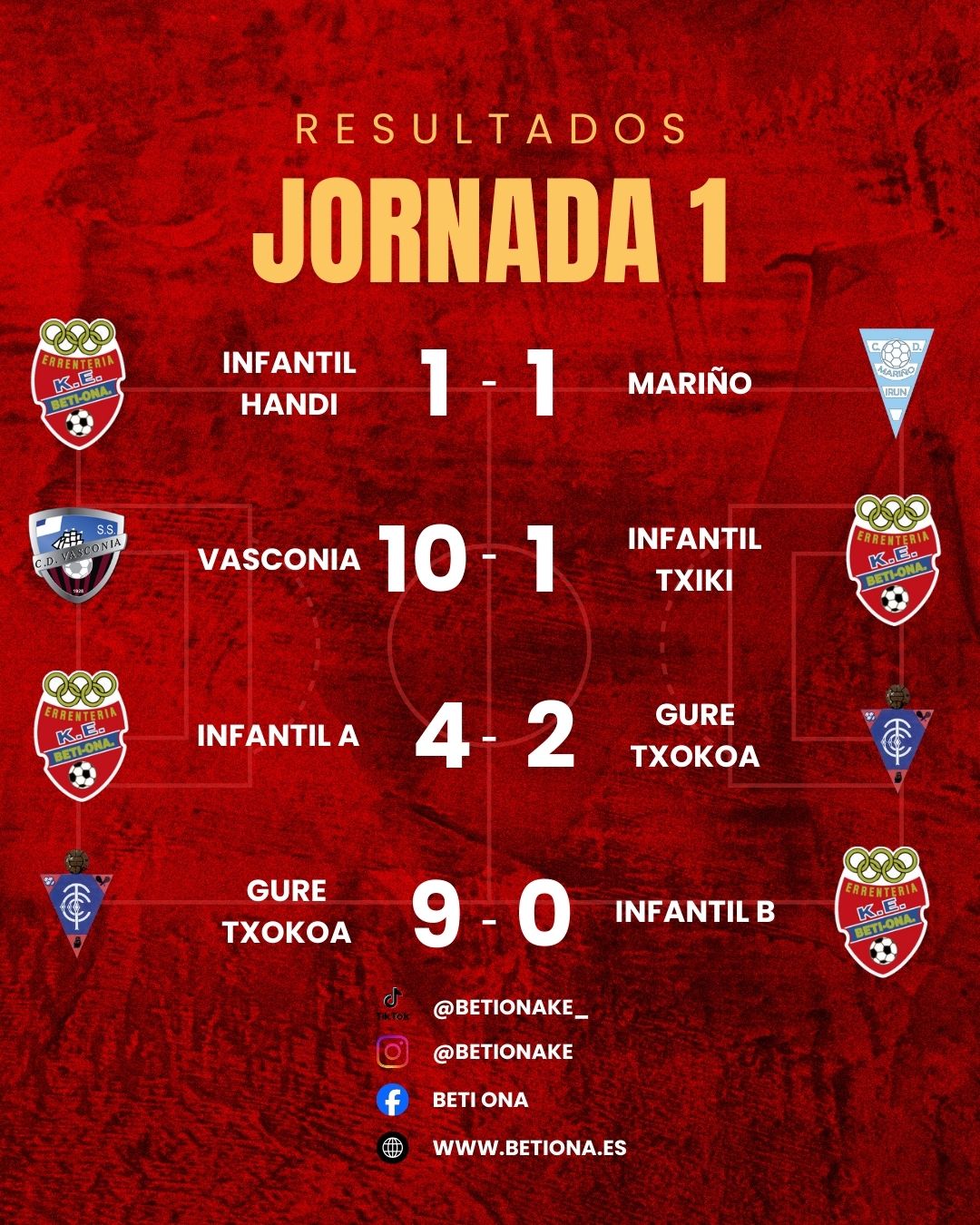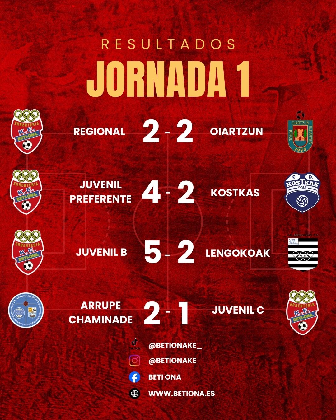 El juvenil consiguió imponerse cómodamente al Kostkas a pesar de un inicio con altibajos. El equipo se adelantó pronto en el marcador, pero los visitantes le dieron la vuelta. Al descanso, el Beti Ona consiguió el empate. Tras la reanudación, el equipo se impuso con relativa facilidad y fue superor, haciendo 2 goles más y dejando el marcador en el definitivo 4-2. ¡Buen trabajo chicos!
