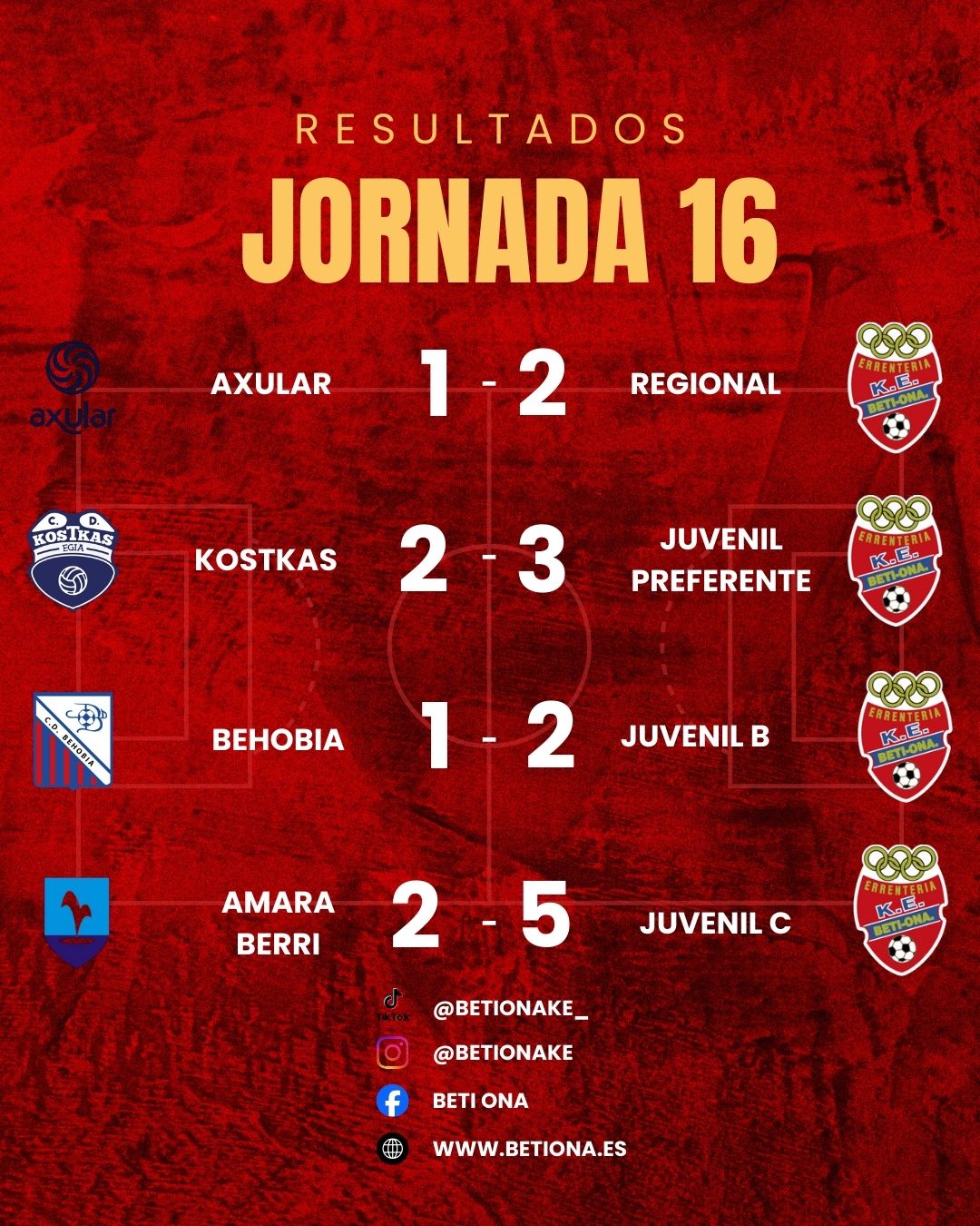 La tarde lluviosa del sábado en Puio, marcó el carácter de un partido gris y trabajado entre Axular y Beti Ona, más práctico que brillante. Los de Alberto e Iñaki firmaron una mala primera mitad, incluso jugando con un hombre más desde el minuto 15 por la expulsión del número 2 local. A pesar del juego áspero y poco vistoso con un inicio igualado, los beraundarras lograron adelantarse en el 20´, con un buen gol de nuestro delantero. Lejos de asentarse en el partido los nuestros no consiguieron hacerse con el control del juego y cedieron la iniciativa al conjunto local, con muchos errores en la salida de balón Un Axular, valiente en la presión y en el juego combinativo encontró el gol del empate en el 32´ tras una jugada en la que no estuvimos hábiles en defensa. Era el 1-1. El descanso llegó como una necesidad para corregir errores y reorganizar al equipo. Tras el paso por los vestuarios los cambios dieron otro aire a los nuestros, que consiguieron mayor presencia por bandas y dispusieron de varias ocasiones claras, frenadas por las grandes intervenciones del portero local. Entre tanto, los locales disponían de una única -pero clarísima- oportunidad, bien resuelta por el guardameta visitante. El Beti Ona no dejó de creer a pesar de que no conseguíamos el juego vistoso y fluido habitual. Fue en el 75´, con un penalti clamoroso favorable, donde nuestros chicos conseguían el merecido segundo gol. El resultado se ponía en 1-2, a falta de 15´; estos estuvieron marcador por la segunda expulsión rival, probablemente fruto de la desesperación y el resultado adverso, que llegó para nuestra alegría hasta el final. Tres puntos importantes en un partido trabado, que nos deja muchas lecturas: cuando no se consigue el dominio deseado, es importante sacar el mejor resultado posible. Todavía queda mucho para llevar al equipo a su máximo nivel. ¡A por ello Regional!