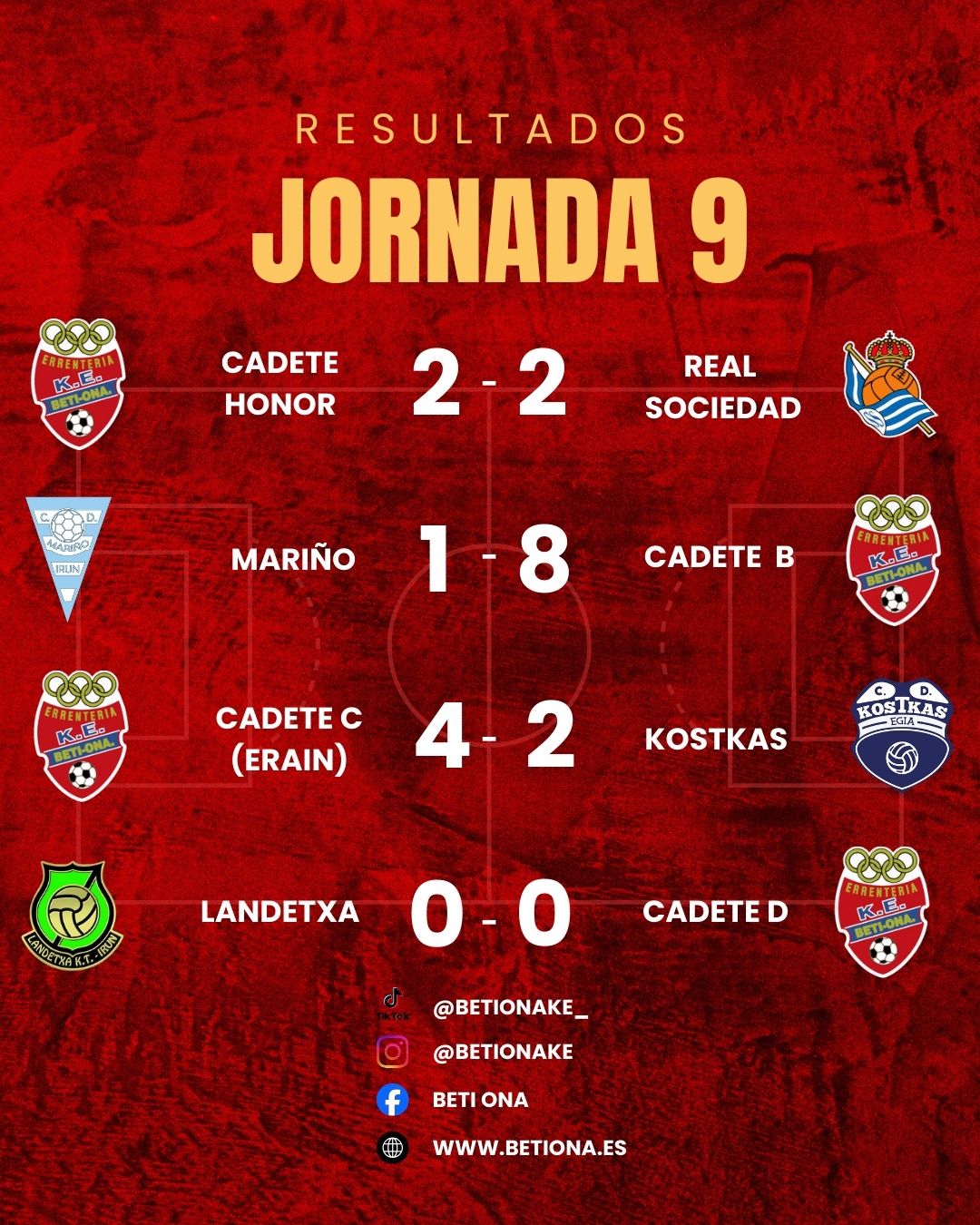 Nuestro Cadete de Honor recibía a la Real Sociedad en la décima jornada de liga, tras un periodo de resultados adversos. Nuestros chicos querían repetir el buen juego realizado en el partido de ida, pero intentando un mejor resultado para devolver la moral y la alegría al grupo. Los de Mikel, Telle e Iván salieron con el claro propósito de realizar una buena defensa y tratar de aprovechar las oportunidades a la contra. En el primer minuto de partido, una buena jugada de los de Beraun hizo el primer gol para la alegría local. Un buen balón a la espalda que supimos aprovechar hizo el 1-0. La alegría no duraría mucho tiempo, ya que un error defensivo por la derecha y un error en el marcaje hizo que el empate llegara 6 minutos más tarde. Los Beraundarras no modificaron su plan de partido y el equipo siguió buscando sus opciones al contragolpe. En una buena jugada por la derecha y tras un centro al área, el Beti Ona consiguió volver a adelantarse en el marcador en el 24´. 2-1. El partido se jugó en campo propio, pero la Real no generaba grandes ocasiones de peligro ante el buen hacer de los nuestros. Al descanso, el resultado era de ventaja por la mínima. Ya en la reanudación el planteamiento no cambió, pero las fuerzas fueron cayendo y costaba generar situaciones de peligro en la meta rival. En el 64´, otro error defensivo por la banda derecha hizo que encajáramos el empate a 2. A pesar de disponer de alguna ocasión para marcar gol ambos equipos, el resultado se mantuvo hasta el final y el cadete suma un nuevo punto y, lo que es más importante, anima a todos los integrantes a seguir creyendo en la mejora y en que podemos seguir consiguiendo puntos. Partidazo defensivo en líneas generales de nuestros chicos que entrenarán esta semana con la motivación y la buena noticia del empate contra una gran Real Sociedad. ¡Gora Beti Ona! ¡Bien hecho chavales!